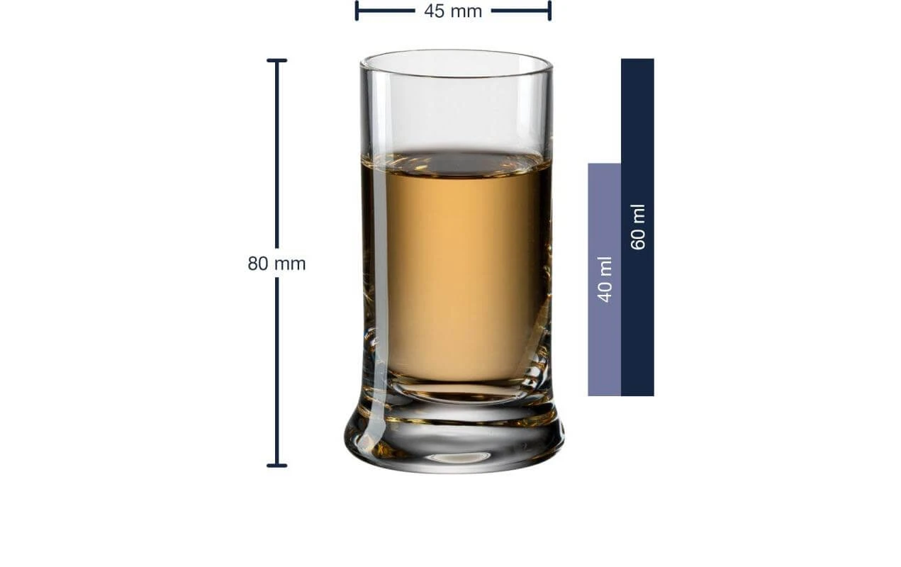 Material: Glas, Höhe: 8 cm, Volumen: 60 ml, Glas Typ: Schnapsglas, Verpackungseinheit: 6 Stück, Detailfarbe: Transparent
